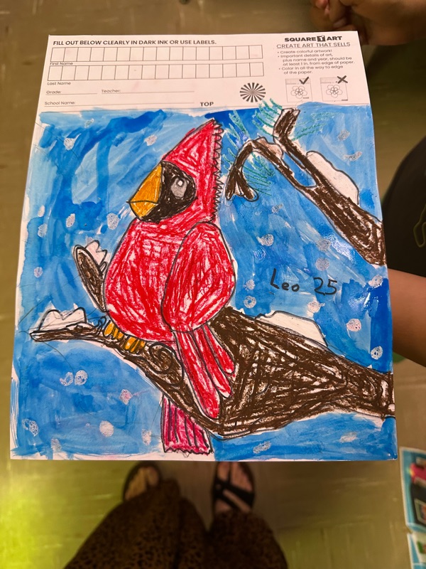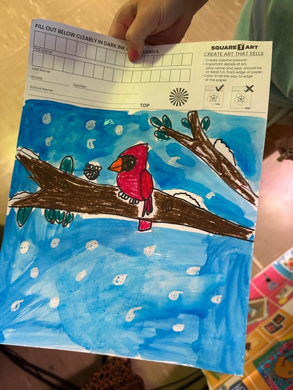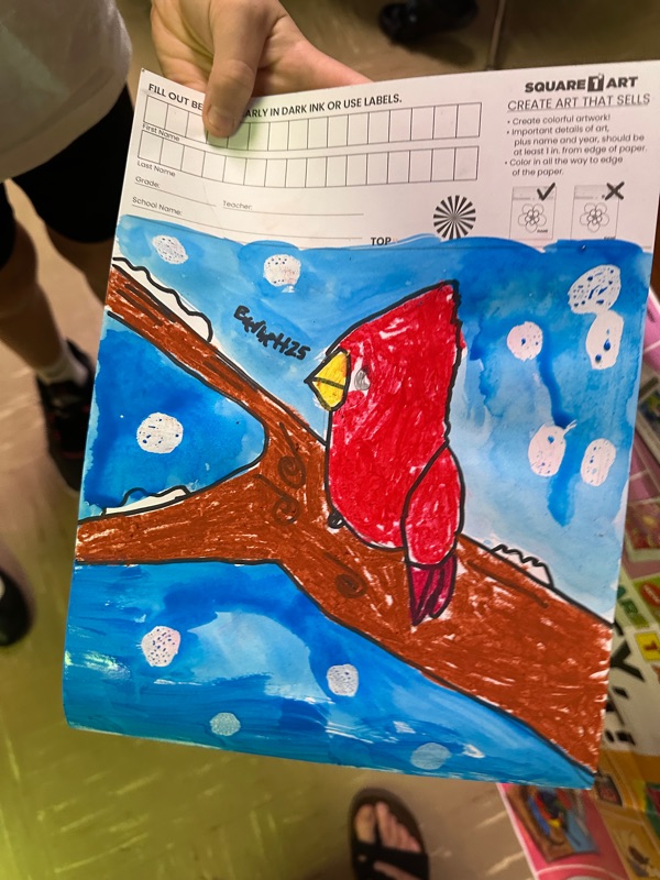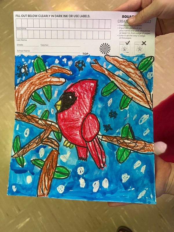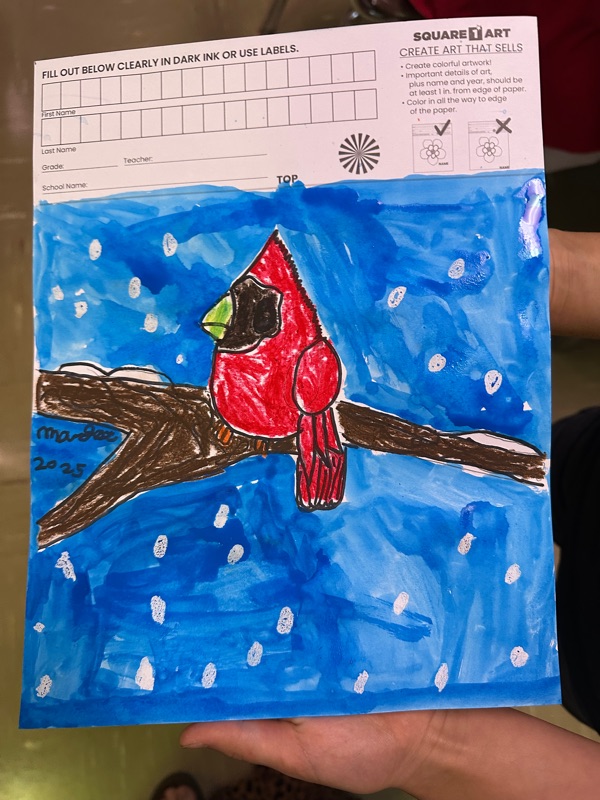 Our 2nd graders have been hard at work creating these beautiful winter cardinals for our Square 1 Art fundraiser! This project took two days to complete and was such a fun way to combine drawing, painting, and mixed media.