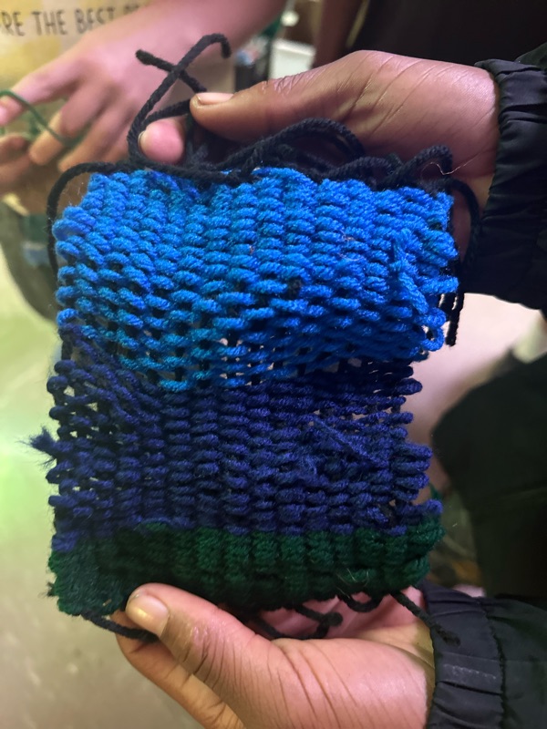 Students chose several colors of yarn and worked step-by-step to weave them together. As they practiced the pattern, they discovered how different color combinations created beautiful designs.